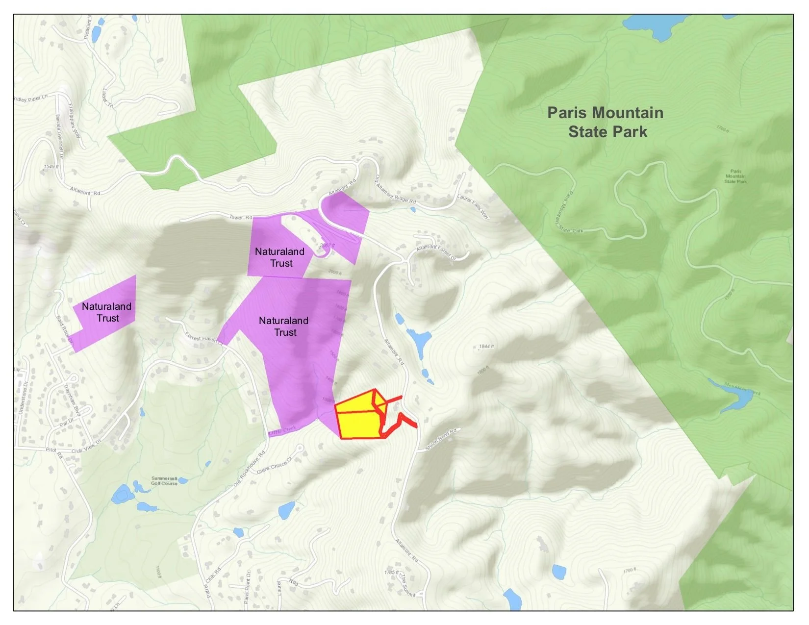 This is exactly what happened with Altamont Ridge, a 9.5-acre parcel on the face of Paris Mountain that was subdivided into four potential homesites. Four hours before the property officially went on the market, we made an offer that was accepted, $80,000 below appraised value. The sellers would not entertain a long closing timeline and we were certain the property would have been developed given the trend that is ravaging what’s left of the empty lots on the mountain, so our board voted to take the risk and borrow the funding to close on the property. What immediately intrigued us about the property was it was built on previously protected land and hosted a significant wooded footprint of the mountain’s southwestern face.