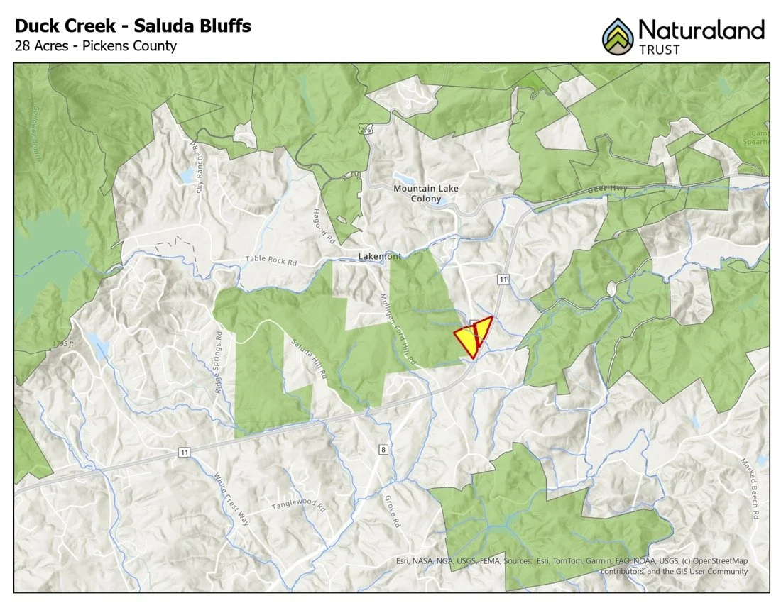 Duck Creek is a 28-acre parcel on the southeastern boundary of the Saluda Bluffs tract, now owned by SCDNR. From the beginning, when we set out to acquire the 1,092-acre Saluda Bluffs property, we hoped it would offer new opportunities for connections to protect the scenic, hydrological, and wildlife corridors around this important anchor. We didn’t know the opportunities would come so quickly. This property brings the protections of Saluda Bluffs to an important intersection on Scenic Highway 11, as it protects both sides of Caesars Head Highway (Highway 8) that heads north before converging with Geer Highway. Protecting nearly half a mile of Highway 11, Duck Creek also protects a mature forest that surrounds a tributary that flows into the South Saluda River.