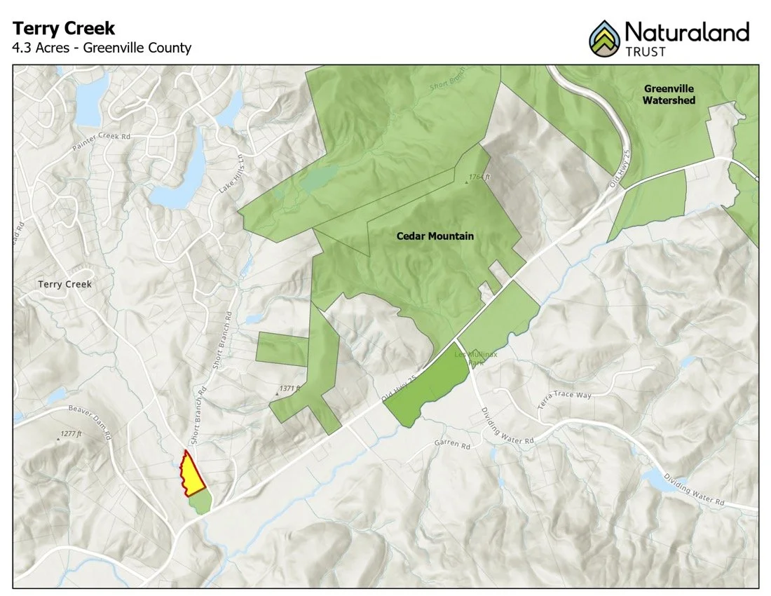 This acquisition builds upon a larger, multi-year conservation initiative in the North Saluda watershed. Just to the north, Naturaland Trust protected the 218-acre Short Branch property last year, where a major dam removal restored natural stream flow and significantly improved aquatic conditions. The restored stream that leaves Short Branch converges directly with Terry Creek, making the protection of this property a logical and impactful next step in improving downstream water quality. The tract is also adjacent to publicly owned land held by Greenville County and sits within a broader landscape of protected lands and ongoing restoration efforts.